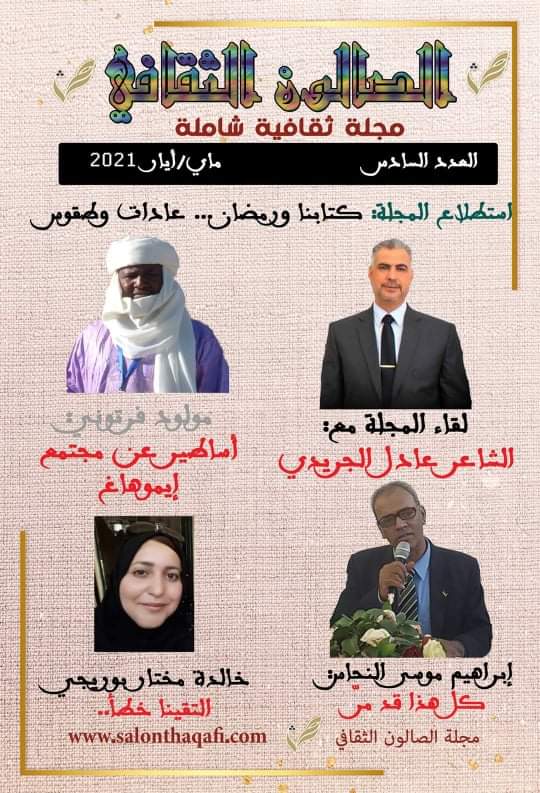 وجاء في كلمة المدير العام الشاعر عزوز عقيل رئيس صالون بايزيد عقيل الثقافي والمدير العام لمجلة الصالون ، ” ها نحن نطل عليكم من جديد في العدد السادس من مجلة الصالون الثقافي، لنرفع التحدي من جديد لنقول لكم ها نحن هنا مازلنا نواصل مسار التحدي ، رغم الكثير من الصعوبات ، ولا شيء نملكه غير الإرادة والتحدي ، كما نوه برئيس التحرير الدكتور عيسى ماروك الذي حمل على عاتقه وزر المجلة الإلكترونية واستطاع في وقت وجيز أن يجعلها من المجلات الرائدة جزائريا وعربيا ولعل الأسماء التي تشارك في أعدادها خير دليل على ذلك كما جاء في العدد السادس من مجلة الصالون استطلاع للأدباء حول يوميات شهر رمضان الكريم وقد ساهم فيه عدد من الكتاب والأدباء، كما حاورت المجلة الشاعر التونسي ونائب رئيس اتحاد الكتاب التونسيين السابق عادل جريدي لتنبش الكثير من محطات الراهن وذاكراته الشعرية ، أما الفصل الخاص بالدراسات النقدية فقد شمل كل من الأستاذ مولود فرتوني في دراسة : أساطير من مجتمع إيمو هاغ” ودراسة نقدية للدكتور عيسى ماروك” النص الأدبي وهيمنة الأنساق، قراءة في المجموعة القصصية المحطة الأخيرة للقاصة والروائية بقعة راقية أما مزهر العاني فقد ساهم بدراسة ” طائر العشق الحزين للشاعر حسين عبد الله الساعدي، أما في المجال الإبداع الشعري فكانت قصيدة مدارات الهوى للشاعر الدكتور محمد الأخضر سعداوي من الجزائر وقصيدة هواجس للشاعر على الحوراتي من الأردن وقصيدة عزف شارد للشاعر العراقي عامر العيساوي وقصيدة دمعتان لصالح خطاب من الجزائر وقصيدة كل هذا قد مر للشاعر والناقد ابراهيم موسى النحاس من مصر وقصيدة سبحانك الله للشاعر العراقي علاء الأديب وقصيدة الضاد الأخرس للشاعر السوري أحمد عبد الرحمن جنيدو وقصيدة إن القطاف للشاعر براء الجميلي من العراق ، أما في الشعر الشعبي فكانت قصيدة “عاميني ويقول ممو عينيا” للشاعرة فضيلة بن سرحان من الجزائر قصيدة بنت العم للشاعر أنور خرخاش أحمد أما في الجانب السردي فقد كان النصيب لقصة “التقينا خطأ” للقاصة الجزائرية خالدة مختار بوريجي وقصة “حجر” للقاصة خيرة بغاديد وقصة “انعكاسات المستحيل” وقصة “ساق للبيع” لصبيحة شبر من العراق وقصة “مدينة الصمت” للقاص السعودي سعود أل سمرة.