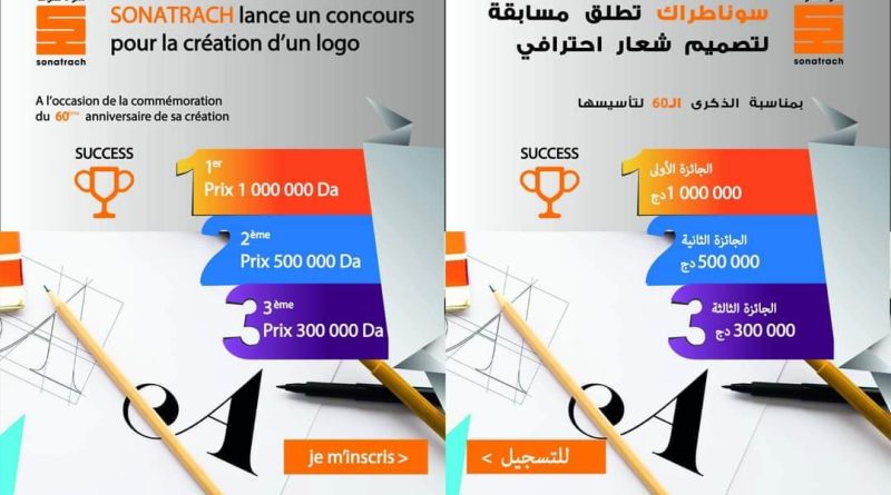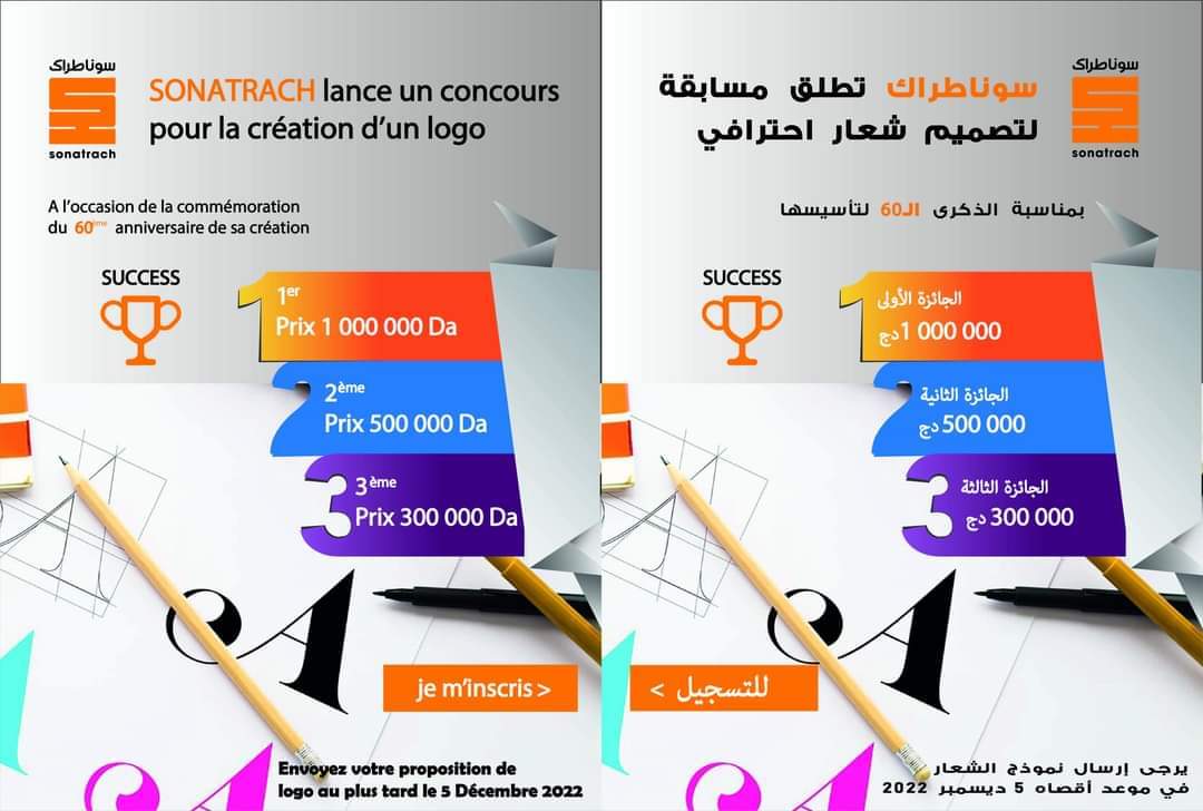 ينظم مجمع سوناطراك مسابقة مفتوحة لكل المواطنين لتصميم شعار رسمي مخصص للاحتفال بالذكرى الستين لتأسيس سوناطراك. التي تصادف تاريخ 31 ديسمبر 2023.