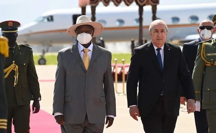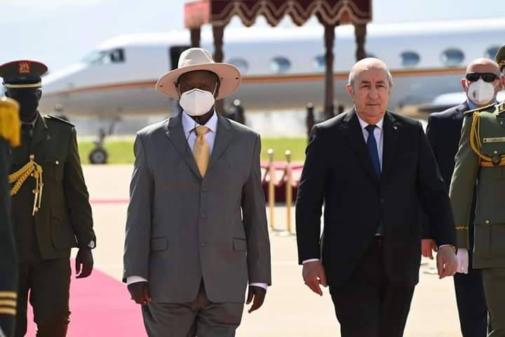 وكان استمع كل من الرئيسان عبد المجيد تبون، ويوويري موسيفيني، إلى النشيدين الوطنيين الخاصين بكل بلد. كما ألقى الرئيس تبون التحية للطاقم المرافق لنظيره الأوغندي. في حين، شهد مطار هواري بومدين، إطلاق المدافع.
