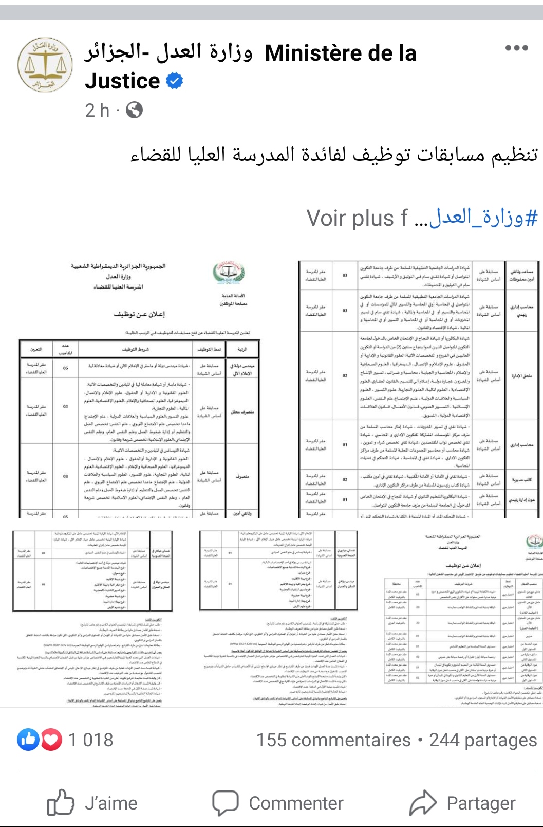وحسب منشور عبر صفحتها الرسمية على موقع “فيسبوك” أعلنت المدرسة العليا للقضاء عن تنظيم مسابقات توظيف عن طريق الإختبار المهني في المناصب التالية: