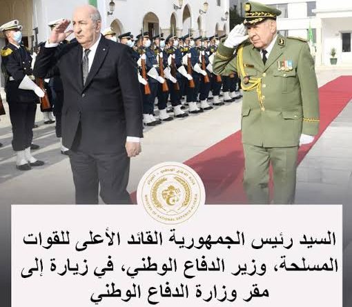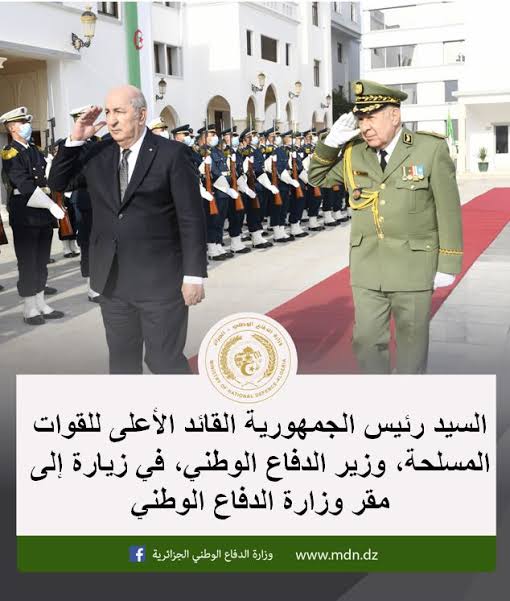 وجاء في بيان لوزارة الدفاع: “رئيس الجمهورية القائد الأعلى للقوات المسلحة وزير الدفاع الوطني السيد عبد المجيد تبون في زيارة لمقر وزارة الدفاع الوطني”.
