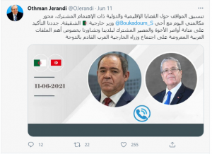 وكتب وزير الخارجية التونسي في تغريدة له عبر صفحته الرسمية على موقع تويتر أن هذه المكالمة جاءت لتنسيق المواقف حول القضايا الإقليمية والدولية ذات الاهتمام المشترك.
