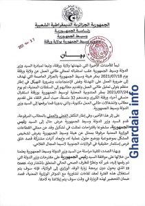 وتلقى مندوب وسيط الجمهورية بورقلة مراسلة من طرف وسيط الجمهورية ليبلغه موافقة رئيس الجمهورية على المطالب المرفوعة من طرف مواطني ولاية ورقلة